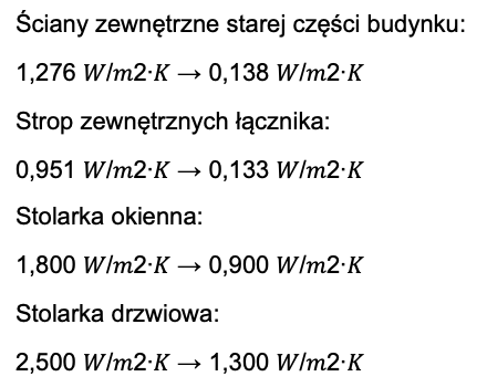 Po przeprowadzeniu termomodernizacji poprawiono współczynniki przenikania ciepła przez przegrody budowlane: