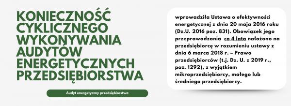 Pamiętaj, że jeżeli pierwszy audyt energetyczny przedsiębiorstwa został przeprowadzony w 2017 roku, drugi w 2021 roku, to zgodnie z obowiązującymi przepisami, kolejny audyt energetyczny przedsiębiorstwa należy przeprowadzić ponownie 2025 roku (audyt trzeba przeprowadzać najrzadziej co 48 miesięcy).